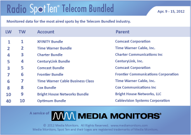 In Telecom Bundled last week nationally, XFINITY BUNDLE was #1 with 10,485 commercials on the radio. TIME WARNER BUNDLE was #2 with 3,285 spots, while CHARTER BUNDLE ran 2,856 spots to take #3. CENTURYLINK BUNDLE were #4 airing 2,629 spots and COMCAST BUNDLE landed in #5 with 2,501 spots. FRONTIER was #6 running 1,780 spots, while TIME WARNER CABLE BUSINESS CLASS was #7 with 1,769 spots. COX BUNDLE was #8 airing 1,611 spots and BRIGHT HOUSE NETWORKS BUNDLE took #9 with 567 spots. And coming in #10 was OPTIMUM BUNDLE with 438 spots.