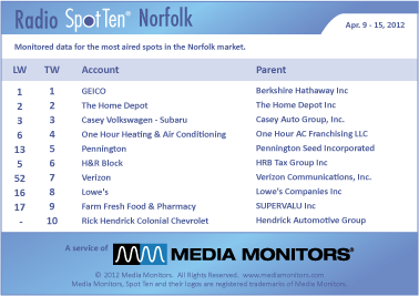 In Norfolk last week the #1 radio advertiser was GEICO with 1,082 spots. Coming in #2 was THE HOME DEPOT with 931 spots, while CASEY VOLKSWAGEN - SUBARU took #3 with 527 ads. ONE HOUR HEATING & AIR CONDITIONING was #4 airing 422 commercials and PENNINGTON was #5 with 412 messages. H&R BLOCK appears in #6 with 383 spots, while VERIZON takes #7 with 371 spots. LOWE'S was #8 running 346 ads and FARM FRESH FOOD & PHARMACY soars to #9 with 334 spots. RICK HENDRICK COLONIAL CHEVROLET was #10 with 314 spots.