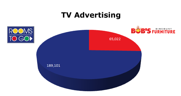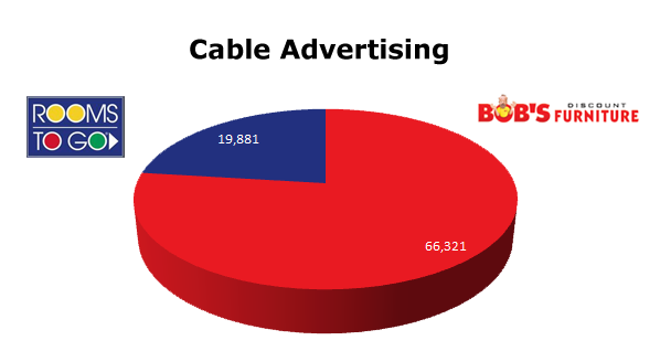 On Local Cable, Bob’s Discount Furniture is way out in front of Rooms To Go. Bob’s ran 66,321 spots in the last 12 months against Rooms To Go’s 19,881 spots. Bob’s biggest month was November 2011 with 7,717, while Rooms To Go ran the most in January of this year with 2,671 ads.