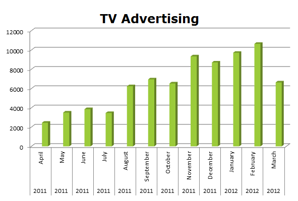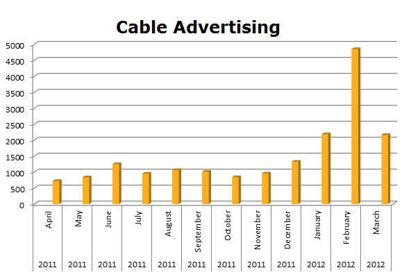 On Local Cable, MetroPCS ran only 18,176 spots in the last 12 months. Their biggest month was February 2012 when they ran 4,852 spots.