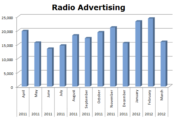 On Radio, MetroPCS ran most of their schedules to the tune of 69.47% of all spots ran in the last 12 months, which totaled 218,914 ads. They ran hottest in February with 24,322 spots, while January 2012 was pretty hot as well with 23,262 spots.