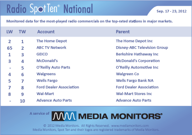 The National Spot Ten got shaken up a bit with THE HOME DEPOT taking back #1 with 36,459 spots. The big gainer was ABC TV NETWORK exploding from #65 to #2 running 32,849 spots hyping its new season. GEICO falls from #1 to #3 with 32,522 spots, while MCDONALD’S was #4 with 27,887 ads. #5 was O'REILLY AUTO PARTS with 27,021 spots.