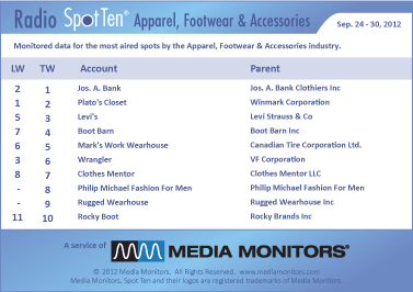 The king of the category was JOS. A BANK with 3,916 spots coming in #1. PLATO’S CLOSET was #2 with 1,338 spots, while LEVI’S landed in #3 with 697 spots. BOOT BARN planted itself at #4 running 638 commercials and MARK’S WORK WEARHOUSE wriggled into #5 with 548 ads. WRANGLER slipped into #6 with 543 spots and CLOTHES MENTOR was #7 airing 438 spots. PHILIP MICHAEL FASHION FOR MEN got dressed at #8 with 224 spots, while RUGGES WEARHOUSE appears at #9 with 172 spots. And coming in #10 was ROCKY BOOT with 145 spots.