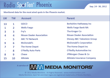 #1 last week in the city of sun was GEICO with 1,016 spots. WELLS FARGO rode into #2 with 884 ads, while FRY’S was stable at #3 airing 800 announcements. NISSAN DEALER ASSOCIATION stayed at #4 with 760 spots and ABC TV NETWORK landed in #5 with 636 spots. MCDONALD’S made it to #6 running 602 commercials and THE HOME DEPOT was solid at #7 with 596 spots. O'REILLY AUTO PARTS parked at #8 with 567 spots and CHASE was #9 with 529 ads. Coming in #10 was ALLSTATE clearing 472 spots.