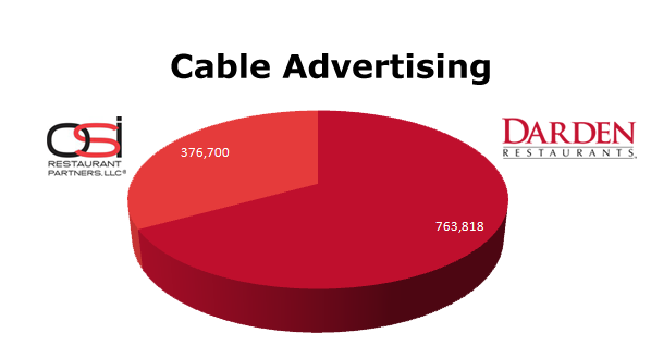 On Local Cable, Darden is well ahead of OSI Restaurants. Darden ran 763,818 spots in the last 12 months, while OSI ran 376,700 ads. OSI’s biggest month was July 2012 with 44,282 spots cleared, while Darden topped out in January 2012 with 82,613 spots.