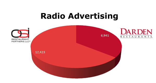 On Local Radio, OSI ran 12,423 spots in the last 12 months, while Darden only ran 6,941 spots in the same period. OSI’s biggest month was April 2012 with 1,749 spots and Darden’s hottest month was the same month April when they ran 1,243 spots.