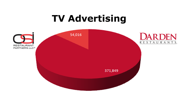 On Broadcast TV, Darden outspent with 371,849 spots against OSI’s 54,016 commercials. OSI’s biggest TV month was July 2012 with 6,800, while Darden ran the most in August 2012 with 40,710 spots.