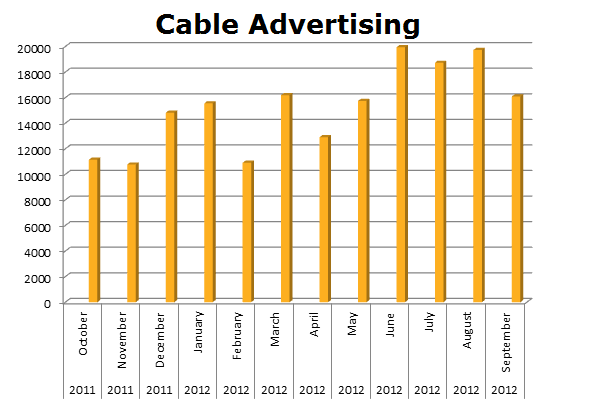 Above all other media, 70.64% of ADT’s spots were run on cable, which totaled 182,519 ads in the last 12 months. Their biggest month was June 2012 when they ran 19,940 spots.