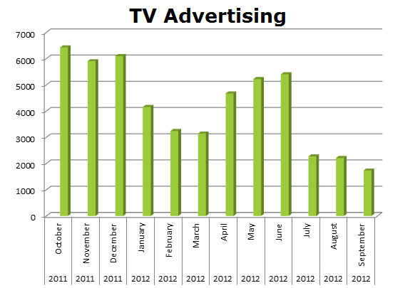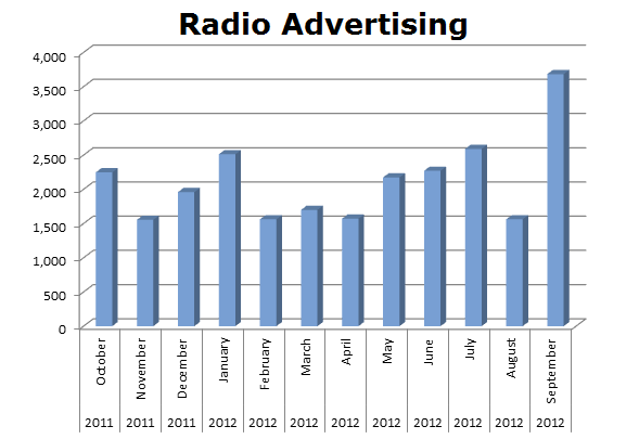 On the Radio, ADT ran only 25,388 spots in the last 12 months, with the biggest month being last month, September 2012, with 3,684 spots.