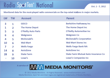 Of Note: BARACK OBAMA FOR PRESIDENT came in #19 with 10,695 spots, while MITT ROMNEY FOR PRESIDENT ran only 1,776 spots for the week. The RNC also ran 1,000 spots for Romney’s campaign, but neither placed in the top 100 radio advertisers for the period; separately or in combination.