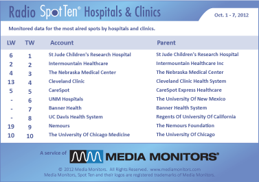 The leader in this category was ST. JUDE CHILDREN’S RESEARCH HOSPITAL with 567 spots. INTERMOUNTAIN HEALTHCARE captured #2 again with 550 ads, while THE NEBRASKA MEDICAL CENTER was #3 with 522 commercials. CLEVELAND CLINIC climbed from #13 to #4 with 504 spots and CARESPOT was solid at #5 airing 450 spots. UNM HOSPITALS secured #6 with 405 ads and BANNER HEALTH was #7 running 375 spots. UC DAVIS HEALTH SYSTEM was #8 with 366 spots, while NEMOURS (Foundation) hit #9 with 359 spots. And coming in #10 was THE UNIVERSITY OF CHICAGO MEDICINE with 347 announcements.