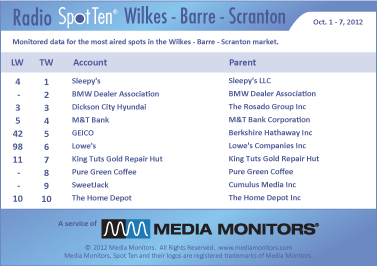 The #1 radio advertiser in Wilkes-Barre Scranton last week was SLEEPY’S airing 355 spots. BMW DEALER ASSOCIATION parked at #2 with 314 ads, while DICKSON CITY HYUNDAI was solid at #3 running 299 commercials. M&T BANK cashed in at #4 with 285 spots and GEICO soared from #42 to #5 with 203 spots. LOWE’S exploded from #98 up to #6 with 198 spots, while KING TUTS GOLD REPAIR HUT rolls from #11 to #7 with 191 ads. SWEET JACK jammed into #9 with 184 spots and THE HOME DEPOT stayed at #10 with 181 spots.