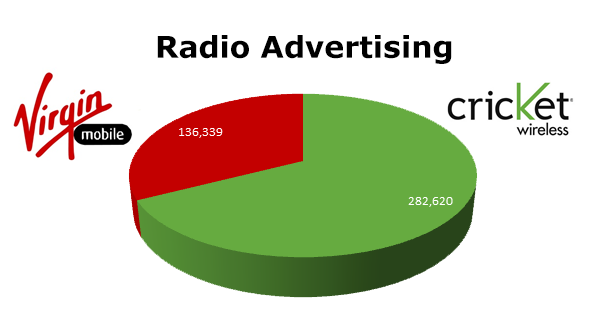 On the Radio, Cricket is out front with 282,620 spots in the last 12 months, while Virgin Mobile aired 136,339 ads in the same period. Virgin’s biggest month was December 2011 when they ran 21,499 spots as well as Cricket when they cleared 41,128 spots in the last month of last year.