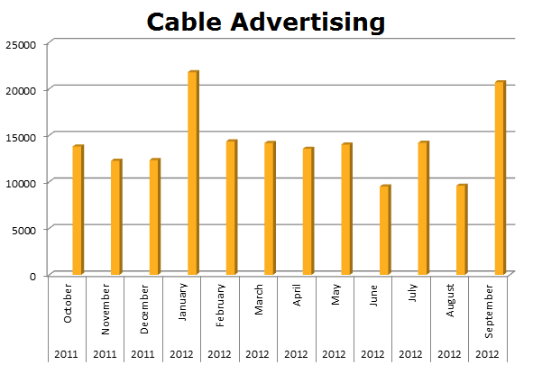 On Local Cable, the two companies are running neck and neck. Cricket Wireless ran 28,954 spots in the last 12 months, while Virgin Mobile ran 25,094 ads. The biggest month on Cable for Virgin was last March 2012 with 9,537 spots and Cricket ran hottest last month September 2012 with 5,544 ads.