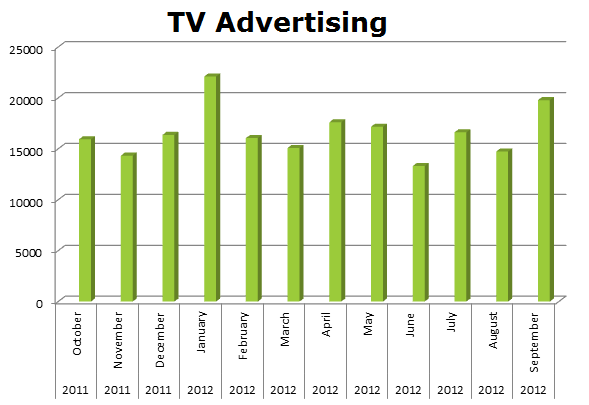 On Broadcast TV, Papa John’s ran the most, overall, on TV at 48.14% of all spots ran in the three media. They ran 199,107 ads in the last 12 months on the tube with their biggest month coming in January 2012 with 22,105 spots.