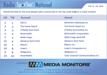 It was GEICO staying on top last week with 45,440 commercials. THE HOME DEPOT keeps #2 with their 38,851 ads, while O”REILLY AUTO PARTS repeats at #3 airing 26,146 spots. MCDONALD’S was #4 with 23,962 spots and new to the top five, WELLS FARGO at #5 with 18,385 spots.