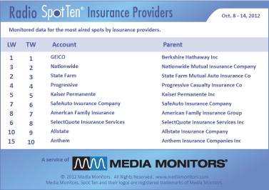 Well, it isn’t any surprise to those who read this page every week that the #1 insurance company on the radio last week was once again GEICO. They ran 45,440 spots. Coming in #2 was NATIONWIDE with 15,143 ads, while STATE FARM was #3 airing 9,589 spots. PROGRESSIVE remained at #4 clearing 6,360 spots and KAISER PERMANENTE stayed at #5 running 4,429 commercials. SAFEAUTO INSURANCE COMPANY captured #6 with 4,231 spots, while AMERICAN FAMILY INSURANCE claimed #7 with 3,764 spots. SELECTQUOTE INSURANCE SERVICES secured #8 with 3,609 spots and ALLSTATE took #9 with 3,154 ads. And at #10 was ANTHEM airing 2,805 spots.
