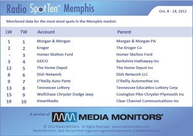 The #1 radio advertiser in Memphis last week was the law firm MORGAN & MORGAN with 689 spots. KROGER was a solid #2 with 558 ads, while HOMER SKELTON FORD drove into #3 with 430 commercials. GEICO held down the fort at #4 running 422 spots and THE HOME DEPOT increased from #12 to #5 with 370 spots. The DISH NETWORK was #6 airing 365 announcements, while O’REILLY AUTO PARTS parked at #7 with 356 spots. TENNESSEE LOTTERY landed at #8 with 313 ads and WOLFCHASE CHRYSLER DODGE JEEP jumped from #15 to #9 with 306 spots. And coming back up from #19 to #10 was IHEARTRADIO with 282 spots.