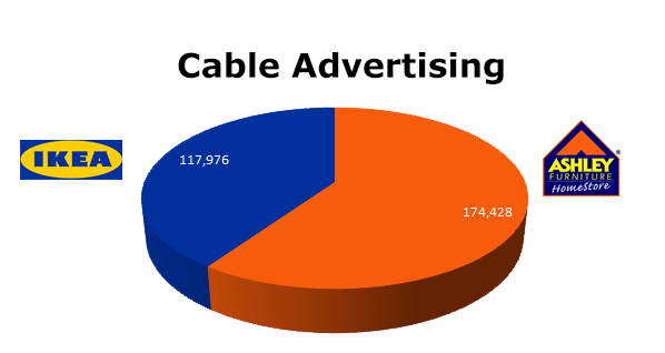 In the last 12 months, IKEA ran 67.4% as many spots as Ashley Furniture on Local Cable. Ashley cleared 174,428 spots, while IKEA ran 117,976 ads. Ashley’s biggest month was February 2012 when they ran 21,740 spots and IKEA ran hottest in July (14,829) and August (14,832).