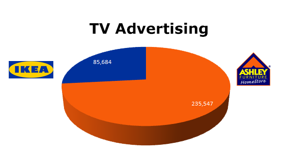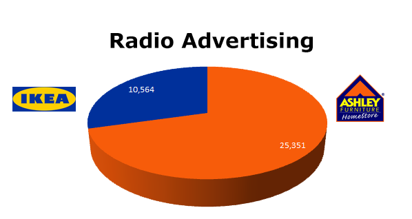 On the Radio, IKEA ran 10,564 spots in the last 12 months, while Ashley topped them with 25,351 ads. Ashley ran the most spots in the month of January 2012 with 4,006 and IKEA cleared the most in August 2012 at 2,085.