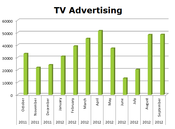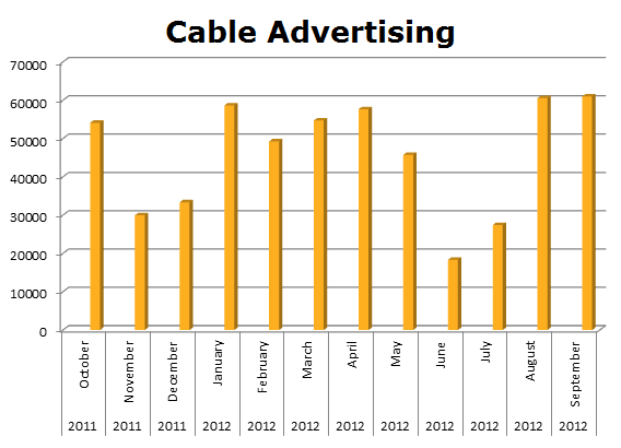 McNeil Healthcare ran 550,794 spots on Local Cable in the last 12 months. There biggest month was September 2012 when they ran 60,998 spots.