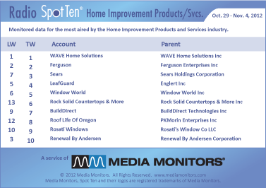In the Home Improvement category, the #1 company was WAVE HOME SOLUTIONS with 2,880 spots. FERGUSON was #2 airing 1,894 spots, while SEARS was #3 running 682 commercials. LEAFGUARD blew into #4 with 581 spots and WINDOW WORLD was clearly #5 with 546 commercials. ROCK SOLID COUNTERTOPS & MORE moved from #13 up to #6 with 377 ads and BUILDDIRECT hit #7 with 373 spots. ROOF LIFE OF OREGON topped off at #6 with 290 spots, while ROSATI WINDOWS closed at #9 with 226 spots. RENEWAL BY ANDERSEN dropped from #3 to #10 with 218 spots.