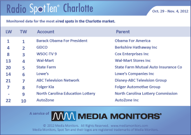 In Charlotte, NORTH CAROLINA, the #1 advertiser on the radio last week was BARACK OBAMA FOR PRESIDENT with 1,355 spots. GEICO was #2 running 796 commercials, while WSOC-TV 9 was #3 with 788 spots. WAL-MART moved from #13 up to #4 with 656 ads, while STATE FARM soared from #20 to #5 with 472 spots. LOWE’S landed at #6 with 397 ads, while ABC TV took #7 with 377 announcements. FOLGER KIA kept pace at #8 airing 371 spots and NORTH CAROLINA EDUCATION LOTTERY came up at #9 with 324 spots. AUTOZONE came in at #10 with 323 spots.