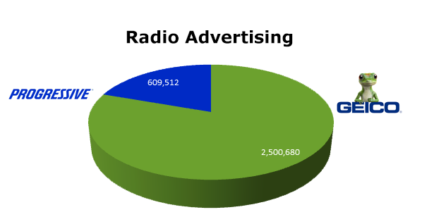 On the Radio, GEICO is way out ahead with 2,500,680 spots making them one of radio’s biggest advertisers in the last 12 months. Progressive ran a very healthy 609,512 spots in the same time range. Progressive’s biggest month on radio was February 2102 with 72,202 spots, while GEICO blasted out 284,908 spots in January 2012.