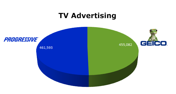 On Broadcast TV, GEICO ran 455,082 spots in the last 12 months, while Progressive cleared 461,593 spots. Progressive ran hottest in January 2012 with 47,792 and GEICO cleared the most spots in August 2012 with 47,721 ads.