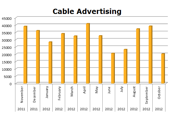 These two giant discount insurance companies buy tons of advertising. On Local Cable, Progressive ran 1,251,328 spots in the last 12 months, while GEICO held a slight advantage with 1,252,505 spots in the same period. Progressive was hottest last month, October 2012 with 120,135 spots, while GEICO’s biggest month was January 2012 with 127,302 ads.