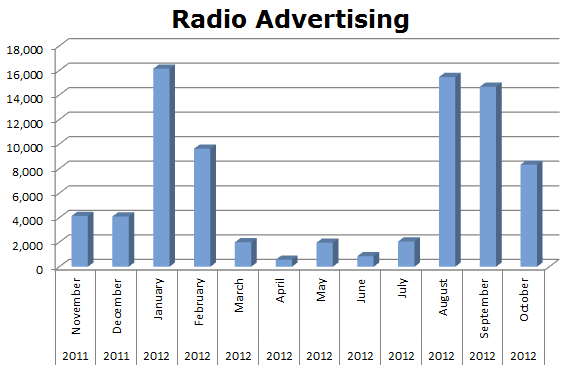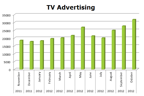 On Broadcast TV, Clorox ran 268,543 spots in the last 12 months with the biggest blast being last month, October 2012, with 31,821 ads.