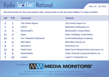 Stepping back into #1 last week it was THE HOME DEPOT running 47,696 spots. GEICO eases back into #2 with 29,625 spots, while MCDONALD’S was solid at #3 airing 25,875 spots. SEARS moves in to #4, from #11 with 23,433 spots. Up from #13 up to #5 with 22,360 spots was FOX TELEVISION NETWORK. Of note: iHEARTRADIO was #9 with 17,283 spots.