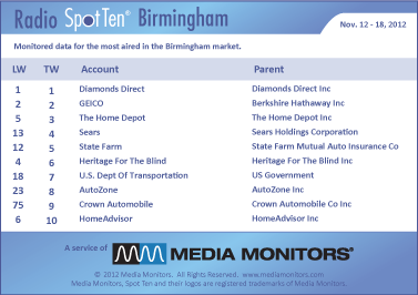 In Birmingham last week the #1 radio advertiser was DIAMONDS DIRECT with 691 spots. Coming in #2 was GEICO with 587 ads, while THE HOME DEPOT was #2 airing 530 spots. SEARS advanced from #13 up to #4 with 465 commercials and STATE FARM locked in at #5 with 381 spots. HERITAGE FOR THE BLIND was #6 running 359 spots, while the US DEPARTMENT OF TRANSPORTATION parked at #7 with 350 ads. AUTOZONE moved up from #23 to #8 with 348 spots and CROWN AUTOMOBILE dealer ascended to #9 from #75 with 344 ads. The HOMEADVISOR (Internet Service) was #10 with 329 spots.