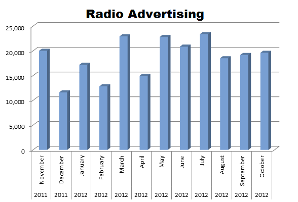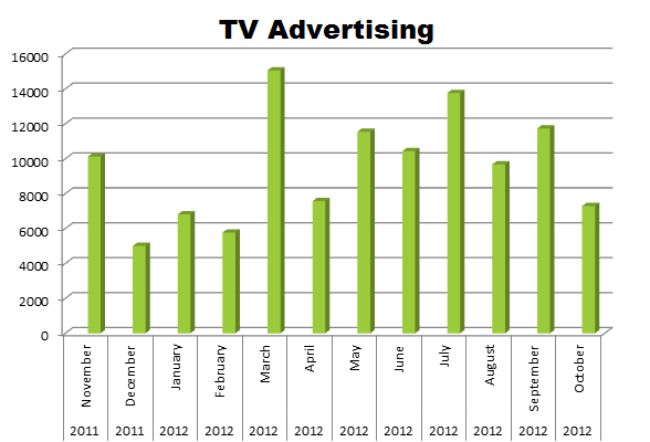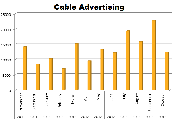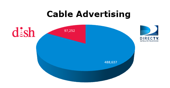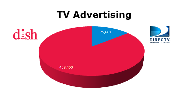 On Broadcast TV, DISH was clearly out ahead with 458,453 spots in the last 12 months, while DIRECTV ran 75,661 ads. DISH ran the most spots in March of 2012 with 54,782 spots against DIRECTV who ran hottest in September 2012 with 10,169 spots.