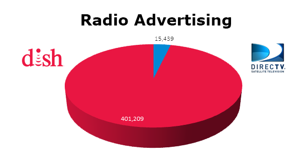 On Radio, we see one company is a big believer, while the other less. DIRECTV ran only 15,439 spots on radio, while DISH Network cleared 401,209 spots in the last 12 months. DISH ran the most spots in the month of July totaling 93,710 spots, while DIRECTV peaked in September with 3,273 ads.