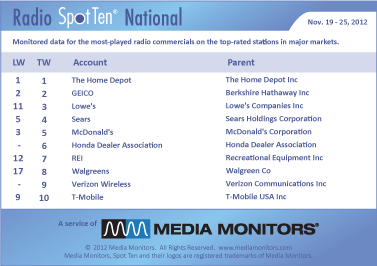 THE HOME DEPOT continues its grasp on #1 with 52,065 radio spots last week. GEICO scored #2 with 40,162 spots and LOWE’S moved from #11 to #3 with 27,715 ads. SEARS was #4 airing 27,700 spots, while MCDONALD’S was #5 with 26,706 spots.