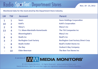 The #1 department store on the radio last week was SEARS with 22,889 spots. The week leading up to Black Friday had KOHL’S coming in #2 with 14,006 spots. MACY’S took control of #3 with 11,376 ads, while T.J.MAXX-MARSHALLS-HOME GOODS moved from #13 up to #4 airing 1,826 commercials. BLOOMINGDALE’S was #5 with 1,358 spots and BEALLS was #6 with 1,030 spots. BURLINGTON COAT FACTORY wrapped up #7 with 919 ads, while BEALLS OUTLET store was #8 with 842 spots. THE BAY was #9 with 614 commercials and ELDER-BEERMAN took #10 with 597 spots.