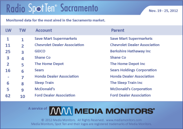 The #1 radio advertiser in the California state capital was SAVE MART SUPERMARKETS with 839 spots. Coming in #2 was the CHEVROLET DEALER ASSOCIATION that ran 755 ads, while GEICO leaped from #25 to #3 with 717 spots. SHANE COMPANY sparkled at #4 airing 625 spots and THE HOME DEPOT landed at #5 running 599 commercials. SEARS moved from #16 up to #6 with 514 ads, while the HONDA DEALER ASSOCIATION cleared 510 spots putting them in #7. SLEEP TRAIN was #8 with 488 spots and MCDONALD’S was lovin’ it at #9 with 487 spots. The FORD DEALER ASSOCIATION leaped from #62 up to #10 with 477 spots.