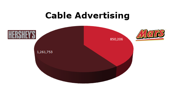 On Broadcast TV Hershey over-powered Mars. Hershey’s ran 1,230,116 spots in the last 12 months, while Mars cleared 380,200 ads. Hershey’s ran the most in the month of July 2012 with 128,301 spots compared to Mars’ biggest month in September 2012 with 43,503 spots.