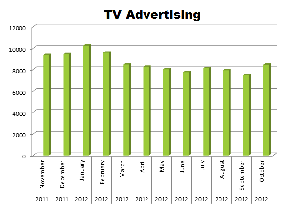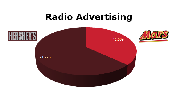 On Radio, Hershey’s again has the advantage with 71,226 spots in the last 12 months, while Mars ran 41,609 spots. Mars ran hottest in July 2012 with 6,688 ads and Hershey’s hit radio hardest last November 2011 with 9,802 spots.
