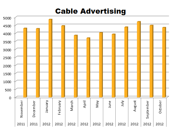 On Local Cable, Menards ran 51,360 spots in the last 12 months. Their biggest months were January 2012 when they cleared 4,859 spots and then in August when they bought 4,716 spots.