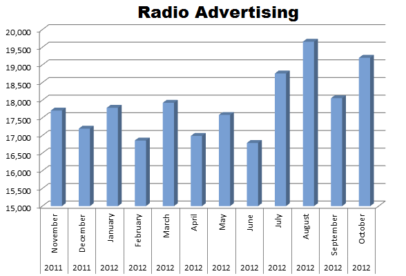 On the Radio, Menards really excelled with 58.16% of all spots placed on radio which totaled 214,511 in the last 12 months. Their hottest month was August with 19,658 ads, Last month, October, was also strong with 19,201 spots.