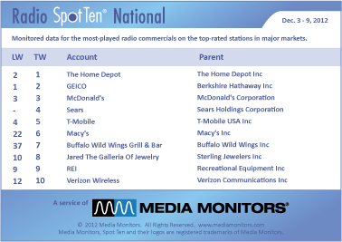 What a difference a week makes as THE HOME DEPOT gets back into #1 with 43,557 spots. GEICO slips to #2 with 39,841 spots, while MCDONALD’S is solid at #3 with 27,223 ads. SEARS appears at #4 with 24,057 as they make their holiday push and T-MOBILE comes in at #4 airing 22,524 spots.