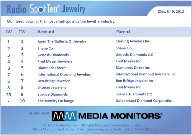 This is a great time of year for the gem people. JARED THE GALLERIA OF JEWELRY is the king with 19,045 spots nationally last week. SHANE COMPANY commanded #2, as they usually do, with 10,076 spots. GENESIS DIAMONDS were #3 with 2,591 spots, while FRED MEYER JEWELERS was solid at #4 with 2,570 ads. DIAMONDS DIRECT took #5 with 2,192 spots and INTERNATIONAL DIAMOND JEWELERS landed at #6 with 1,559 spots. BEN BRIDGE JEWELER was #7 with 1,558 spots and LITTMAN JEWELERS stayed at #8 airing 873 spots. SPENCE DIAMONDS moved from #23 to #9 with 833 spots and coming in #10 was THE JEWELRY EXCHANGE with 828 spots.