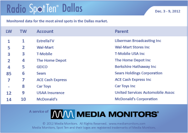In Big D last week the #1 radio advertiser was ESTRELLA TV (Liberman) with 1,285 spots. #2 was WAL-MART running 923 spots, while T-MOBILE was solid at #3 airing 864 spots. THE HOME DEPOT was #4 with 808 commercials and GEICO took #5 with 781 spots. SEARS soared from #85 to #6 with 677 spots, while ACE CASH EXPRESS stayed at #7 with 555 spots. CAR TOYS took #8 with 518 ads and USAA INSURANCE landed at #9 airing 481 announcements. MCDONALD’S was lovin’ it at #10 with 462 spots.