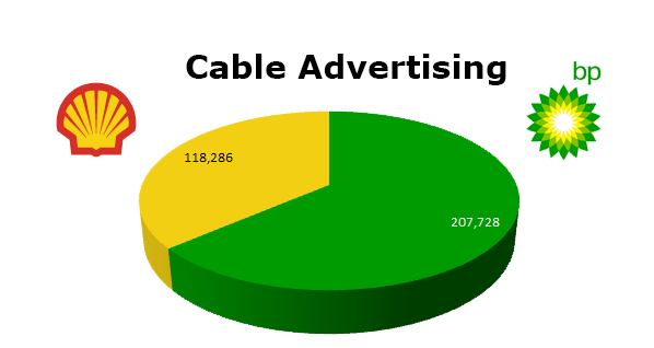 On Local Cable, BP ran 207,758 spots in the last 12 months compared to Shell's 118,286 spots. Shell's hottest month was April 2012 when they ran 21,906 spots, while BP's big month was July with 34,241 ads.