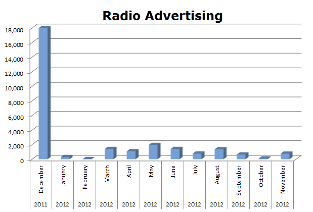 After December of last year, Novartis did not use a lot of Radio. They ran only 27,819 spots on that media in the last 12 months. Last December they ran 17,985 spots.