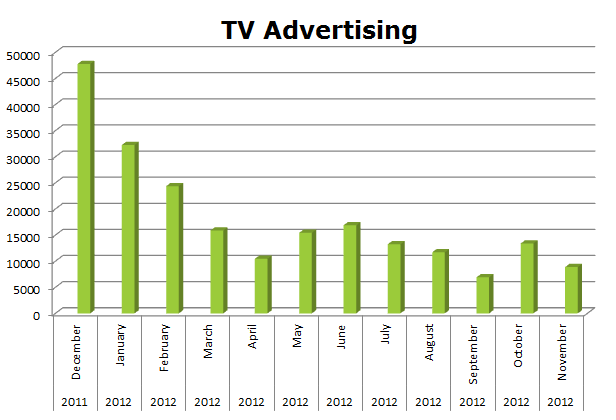 On Broadcast TV, Novartis ran a total of 217,179 spots in the last 12 months with the biggest month being December 2011 when they cleared 47,776 spots.