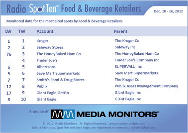 In the Food and Beverage category the #1 advertiser on radio was KROGER with 8,681 spots. Coming in #2 was SAFEWAY STORES with 4,920 spots, while THE HONEYBAKED HAM COMPANY swelled from #76 to #3 with 3,897 spots. TRADER JOE’S traded at #4 airing 3,362 announcements and ALBERTSONS landed at #5 with 2,359 ads. SAVE MART SUPERMARKETS was #6 with 2,044 ads and SMITH’S FOOD AND DRUG STORES was solid at #7 with 1,863 spots. PUBLIX was #8 with 1,857 spots and GIANT EAGLE-GETGO got #9 airing 1,795 spots. And coming in #10 was GIANT EAGLE with 1,528 spots.