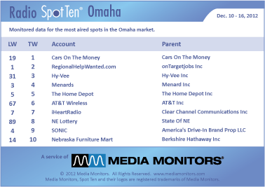 In Omaha last week, the number one radio advertiser was CARS ON THE MONEY with 512 spots. REGIONALHELPWANTED.COM came in #2 airing 459 ads, while HY-VEE vaulted from #31 to #3 with 426 spots. MENARDS was #4 with 408 commercials and THE HOME DEPOT remained at #5 airing 392 spots. AT&T WIRELESS leaped from #67 up to #6 with 374 ads, while IHEARTRADIO remained at #7 with 350 announcements. NEBRASKA LOTTERY exploded from #89 up to #8 running 341 spots and SONIC was #9 with 330 ads. And coming in #10 was the NEBRASKA FUNITURE MART with 324 spots.